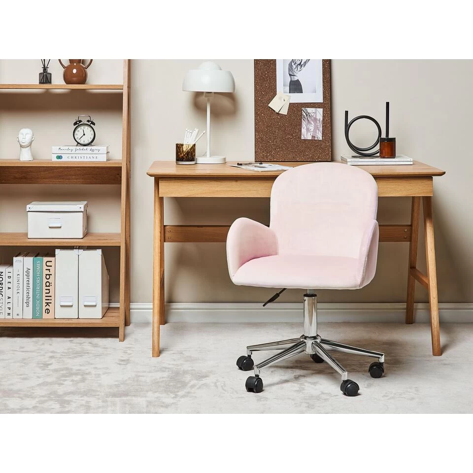 Gestoffeerde stoel met armleuningen. Upgrade de uitstraling van je kantoorruimte door er een comfortabele fauteuil met een gezellige uitstraling aan toe te voegen. De brede en dik gecapitonneerde zitting is bekleed met fluwelen stof in een prachtige kleur die mooi overeenkomt met de retro-geïnspireerde vorm van het meubel. Het duurzame metalen onderstel garandeert stabiliteit en dankzij de ingebouwde wielen en de gasveer kun je het meubel gemakkelijk aanpassen aan je behoeften.