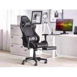Moderne gaming bureaustoel in zwart/militair patroon. De perfecte stoel voor lange gaming-sessies, deze bureaustoel met kunstleren bekleding benadrukt een ontwerp dat langdurig comfort garandeert. Met de talrijke mogelijkheden voor hoogte- en armleuningaanpassingen kun je het verstellen aan jouw lichaamsbehoeften. De zitting van de stoel is voorzien van memory foam dat zich vormt naar de contouren van je lichaam, drukpunten vermindert en een superieur comfort biedt. Extra kussens in de nek- en lendenstreek bieden verlichting voor de wervelkolom, en dankzij een uitschuifbare voetensteun kun je je benen volledig strekken.