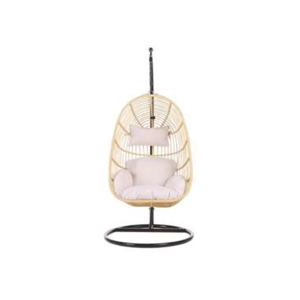 Moderne hangstoel in beige met zwart frame inclusief kussens. Een stabiel stalen frame gecombineerd met een prachtige gevlochten mand in een kleur die in elk interieur past en een feel-good karakter aan de ruimte geeft. Dankzij het sterke ketting-ophangsysteem kun je heerlijk heen en weer schommelen. De charmante boho-look van dit model en de zachte, waterbestendige kussens zorgen voor een onbezorgd gevoel, zodat het verblijf op de veranda, het balkon of in de slaapkamer een heerlijk avontuur wordt.