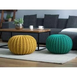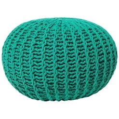 Comfortabele gebreide poef in smaragdgroen. Als je op zoek bent naar een vrolijk accent om je interieur op te vrolijken, dan is deze schattige gebreide ronde poef perfect. Met dik weefsel in een warme kleur en stevige, hoogwaardige vulling, kan het dienen als voetenbank, als basis voor een tafeltje of gewoon als decoratief stuk – de mogelijkheden zijn eindeloos. Wees creatief met het mixen van kleuren en maten om een ideale compositie voor je woonruimte te maken en geniet van de charmante moderne sfeer.
