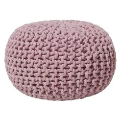 Roze ronde katoenen poef. Als je op zoek bent naar een vrolijk accent om je interieur op te vrolijken, dan is deze schattige gebreide ronde poef perfect. Met dik weefsel in een warme kleur en stevige, hoogwaardige vulling, kan het dienen als voetenbank, als basis voor een tafeltje of gewoon als decoratief stuk – de mogelijkheden zijn eindeloos. Wees creatief met het mixen van kleuren en maten om een ideale compositie voor je woonruimte te maken en geniet van de charmante moderne sfeer.
