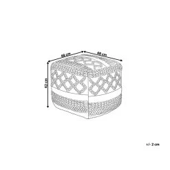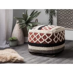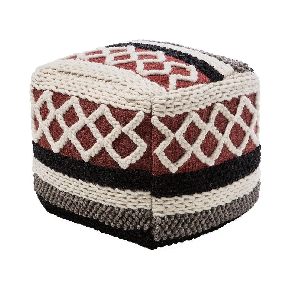 Vierkante poef met bont patroon. Deze handgemaakte poef met mooi gebreide ontwerp is een echt juweeltje en geeft elke woonkamer een gezellige sfeer in boho-stijl. Het patroon in combinatie met de verschillende kleuren maakt de poef tot het deco-accessoire bij uitstek.
