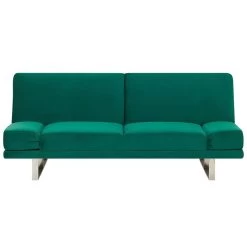 Moderne, groene slaapbank gemaakt met fluweel in Scandinavische stijl. Deze hoogwaardige stilistische bank is prachtig gestoffeerd en kan in enkele ogenblikken worden omgebouwd van een zit-meubel tot een heerlijk bed. De rugleuning van de slaapbank is eenvoudig neer te klappen, zodat er een lig-vlak ontstaat waarop je heerlijk kunt slapen of gewoon relaxen.