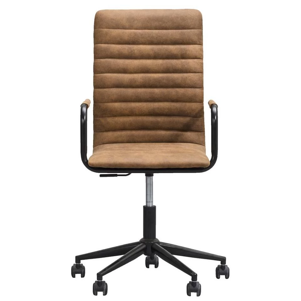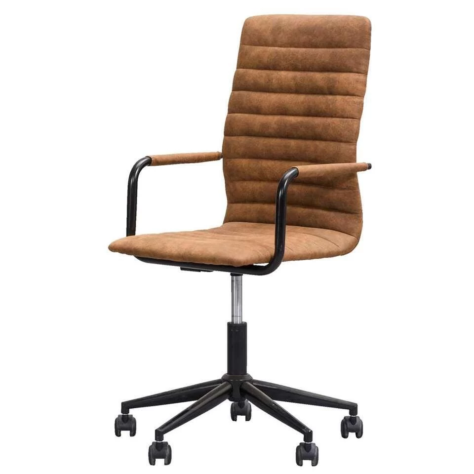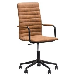Bureaustoel Kyan is een klassieke stoel met een comfortabele zit. De stoel is bekleed met leatherlook bekleding. Deze bureaustoel heeft een camel kleur en een metalen voet waardoor deze altijd in jouw woon- en werkinterieur past. De zithoogte van deze stoel is in hoogte verstelbaar. De stoel is verrijdbaar en dat geeft je extra bewegingsruimte! De wielen van deze bureaustoel zijn geschikt voor een harde ondervloer.