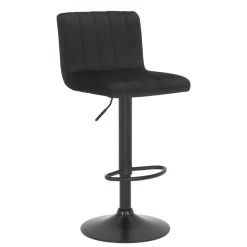 Deze barkruk geeft elke ruimte een exclusieve uitstraling en overtuigt niet alleen door zijn uitstekende zit eigenschappen, maar ook door zijn moderne design. De zitting is bekleed met een gemakkelijk te onderhouden fluwelen hoes. Met behulp van de gasveer kan dit model traploos op de gewenste hoogte worden ingesteld, zodat het ideaal geschikt is voor elke aanrechthoogte. De voetsteun, die voor een zeer goed zitcomfort zorgt, kan synchroon met de hoogte van de zitting worden versteld. De zitting kan samen met de voetsteun 360° gedraaid worden. De trompetvoet van zwart metaal heeft vloerbeschermers aan de onderkant om te voorkomen dat er krassen op oppervlakken komen.