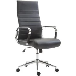 De exclusieve bureaustoel Columbus overtuigt niet alleen met zijn moderne uiterlijk, ook in termen van comfort kan niemand hem voor de gek houden. De hoogwaardige bekleding en de onderhoudsvriendelijke kunstlederen overtrek zorgen voor een aangename zitervaring. De zithoogte is traploos instelbaar en garandeert een ergonomische zitpositie. Bovendien is de bureaustoel uitgerust met een kantelmechanisme, dat meer bewegingsvrijheid biedt. Het elegante chromen frame en de stevige gebogen armleuningen met kunstlederen overkapping geven het geheel iets extra’s. De stabiliteit wordt verzekerd door het metalen frame in chroomlook.