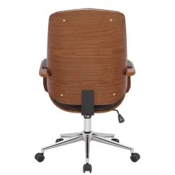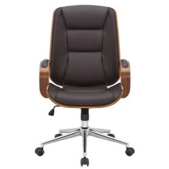 De Yankton is een stijlvolle bureaustoel met een zeer hoge kwaliteit bekleding bekleed met kunstleer. Kunstlederen bekledingen heeft het voordeel dat zij elastisch is en weer soepel word als de last wordt weggenomen. Dit ziet er niet alleen mooier uit, maar verlengt ook de levensduur van de stoelbekleding. Het houten frame van gebogen hout maakt van deze bureaustoel een absolute blikvanger en geeft hem een edele vormgeving. Dankzij de traploos instelbare zithoogte is ergonomisch zitten gegarandeerd en het ingebouwde kantelmechanisme zorgt voor meer bewegingsvrijheid. Het frame is gemaakt van chroomkleurig metaal en is zeer stabiel. De bureaustoel staat stevig op vijf licht lopende wieltjes. Ongeacht of het een harde vloer of een tapijtvloer betreft, u zult altijd zich gemakkelijk en losjes over de vloer kunnen rollen.