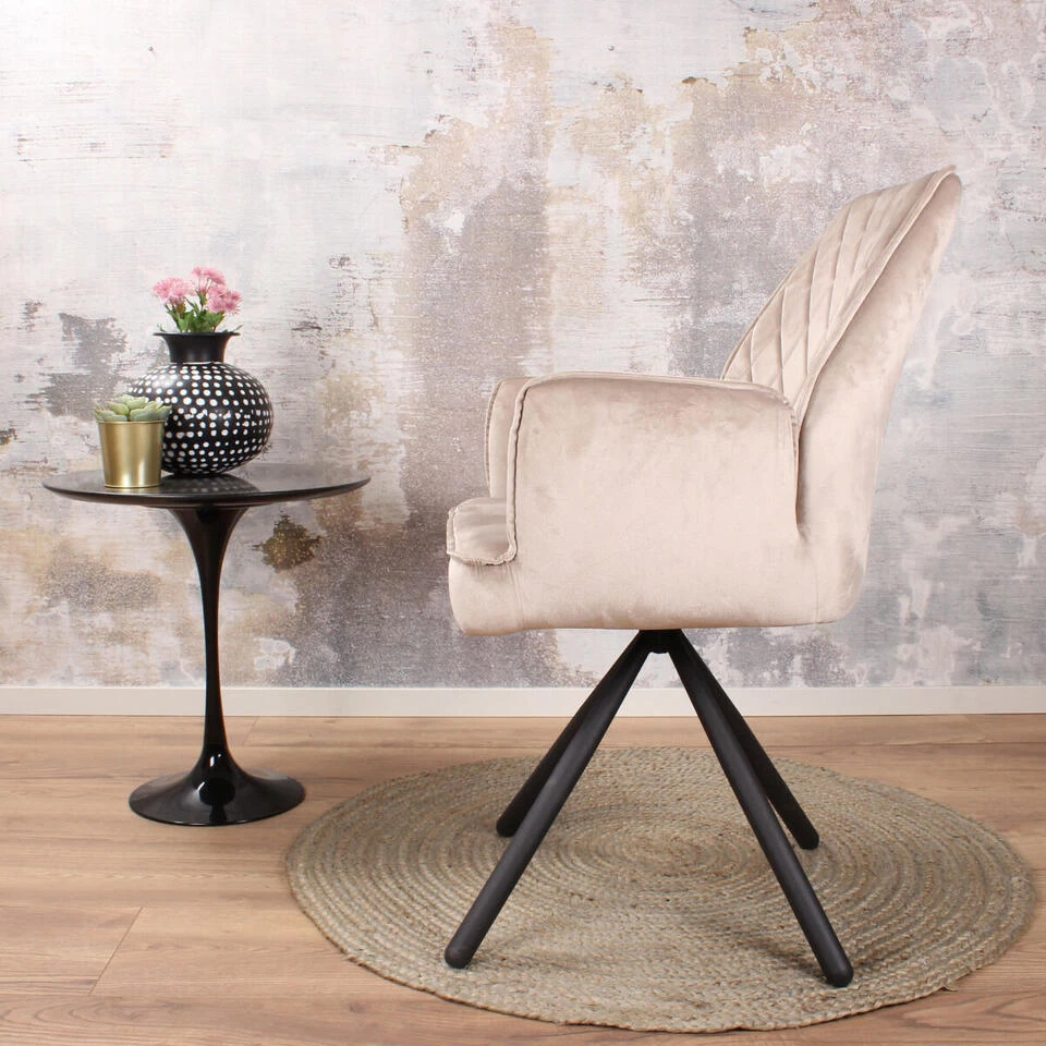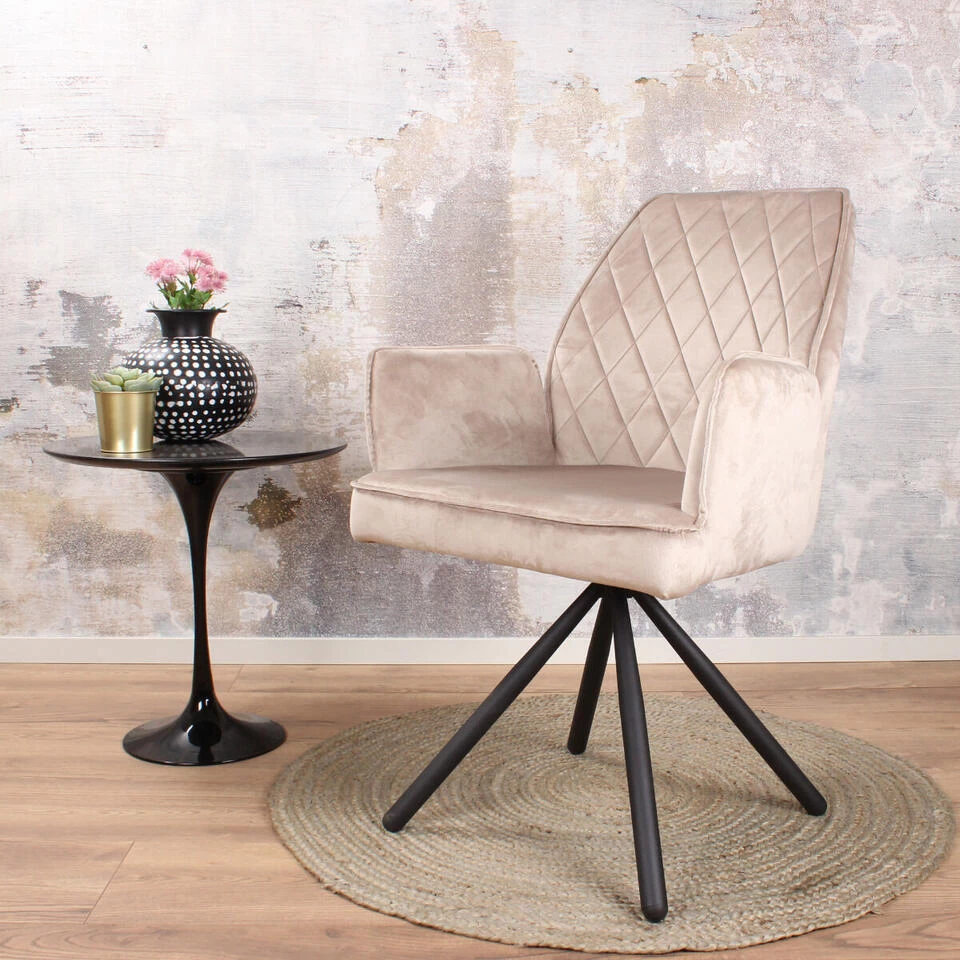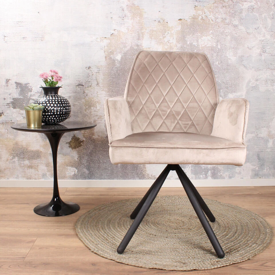 Stijlvol, comfortabel en stoer! Dat zijn de kenmerken van de Armstoel Lucio. Het bijzondere van deze eetkamerstoel is dat hij draaibaar is. De zitting van deze stoel is bekleed met sterk en zacht velours. Daarnaast is de rugleuning voorzien van een sierlijk ruitpatroon. Deze stoel staat op een stevig zwart gepoedercoat stalen onderstel in de vorm van een vierpoot. Om deze stoel extra comfort te geven is hij uitgevoerd met armleuningen. Deze stoel komt perfect tot zijn recht in een industrieel, modern, landelijk of vintage interieur. Armstoel Lucio is verkrijgbaar in vijf populaire kleuren: champagne, zwart, goud, roze en groen.