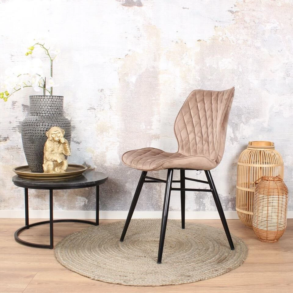 De Ruby 2.0 eetkamerstoel heeft een mooi en tijdloos design. Het is een comfortabele stoel, welke is afgewerkt met mooie materialen. De zitting is bekleed met een zachte velours stof in een trendy champagne kleur. Het onderstel bestaat uit vier poten, welke onderling met elkaar verbonden zijn, en is uitgevoerd in stevig zwart gelakt staal. Deze stijlvolle stoel is te gebruiken in allerlei ruimtes waaronder de keuken, eetkamer, woonkamer en slaapkamer, maar ook op kantoor of voor een horecagelegenheid. Combineer hem ook met de roze, zwarte of groene variant voor een speels en persoonlijk effect in uw interieur!