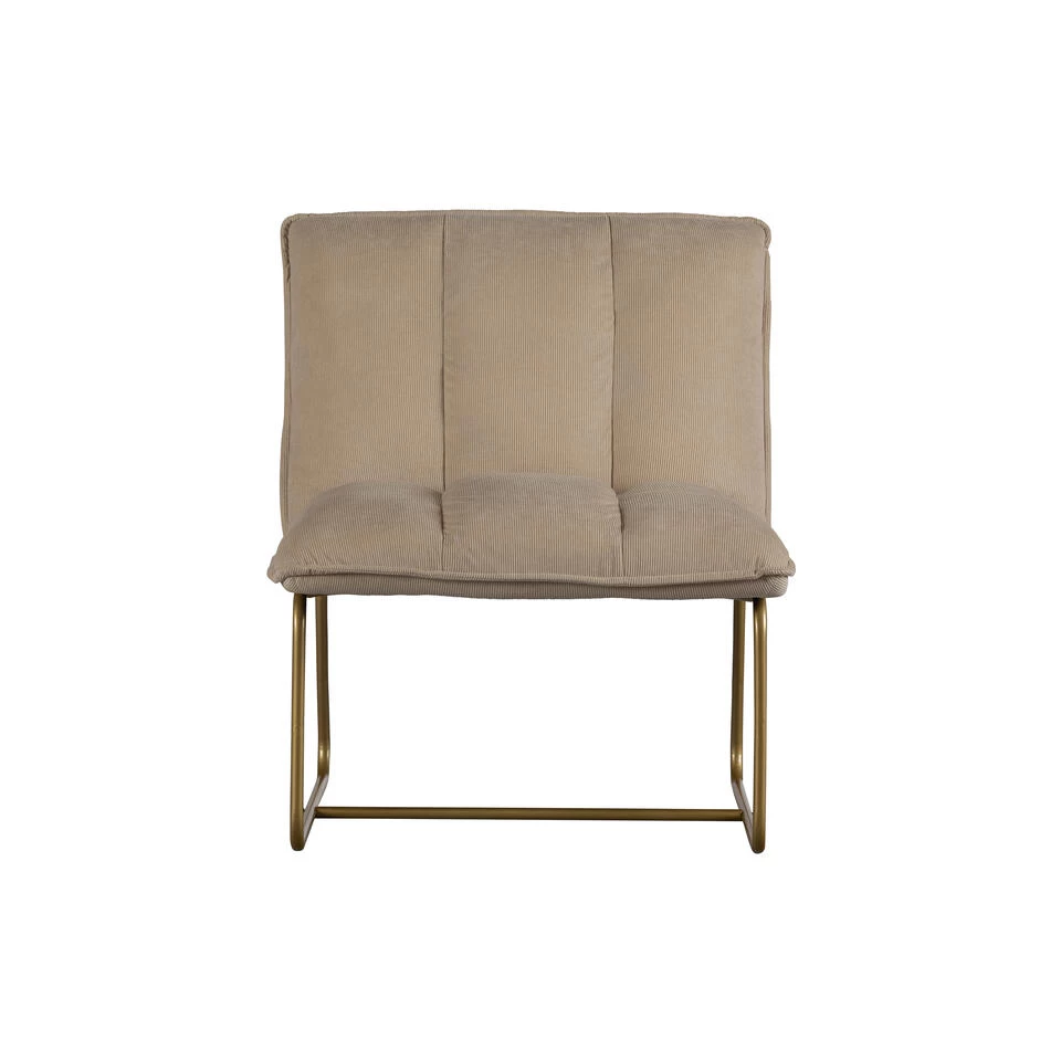 Deze trendy fauteuil Fie is van het Nederlandse merk WOOOD. De fauteuil is gestoffeerd met een zandkleurige ribstof van 100% polyester gecombineerd met een goudkleurig onderstel. De fauteuil zit comfortabel en heeft een uitnodigend karakter. De fauteuil heeft een zithoogte van 45 cm, een zitdiepte van 48 cm en de zitbreedte is 64 cm. De poothoogte van de stoel is 33 cm. Het zit- en rugkussen heeft een PU-vulling.