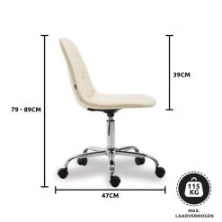 De stoel staat erg stabiel op vijf zwenkwieltjes en een frame van metaal in chroomlook. Het praktische ontwerp maakt het geschikt voor kleinere ruimtes en flexibel in gebruik. Of het nu harde of zachte ondergrond is, u zult altijd gemakkelijk en losjes over de vloer kunnen verplaatsen. De bureaustoel wordt gedemonteerd geleverd.